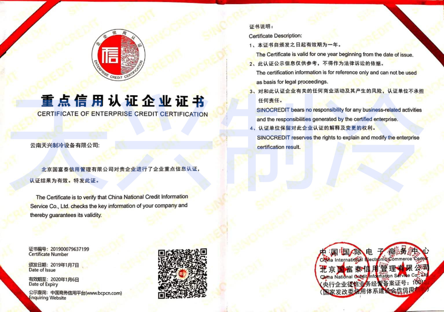 重點信用認證企業證書